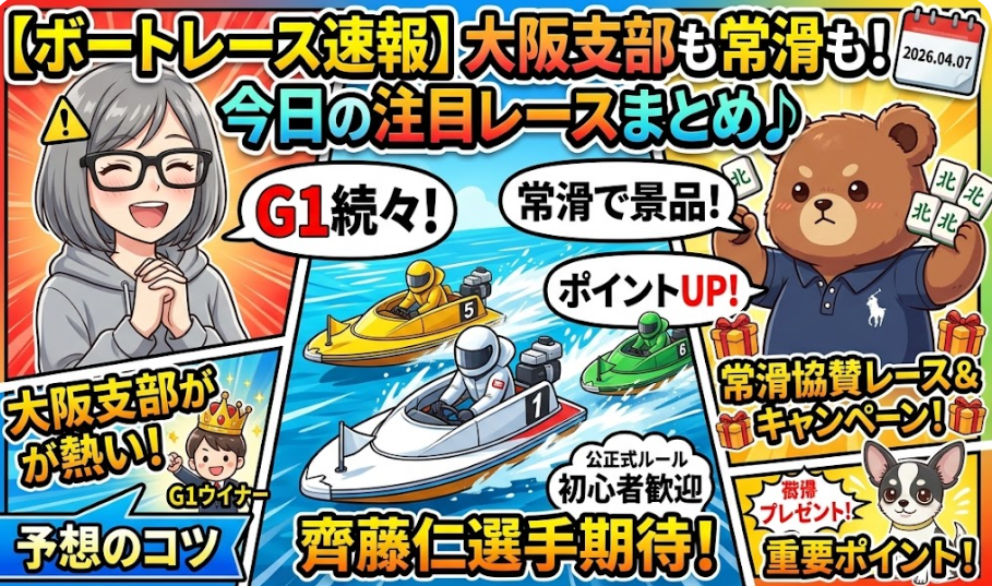 皆さん、こんにちはー!ボートレース大好き、なみだよっ🚤💨 今日も最新のボートレース情報が飛び込んできたから、みんなに熱くお届けしちゃうね!わくわくが止まらないニュースばっかりで、なみも今から興奮しっぱなしだよ〜!
