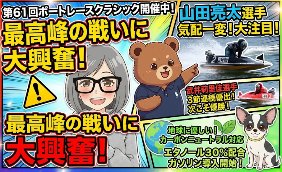 いよいよ「第61回ボートレースクラシック」が終了したね!これはSG(スペシャルグレード、ボートレースの最高峰レースだよ!)って言って、トップ選手だけが出場できる特別な大会なの!全国の猛者たちが熱いレースを見せてくれるて、毎日画面に釘付けになっちゃうたね!みんなも一緒に、この最高の舞台もう一度見て見よう!