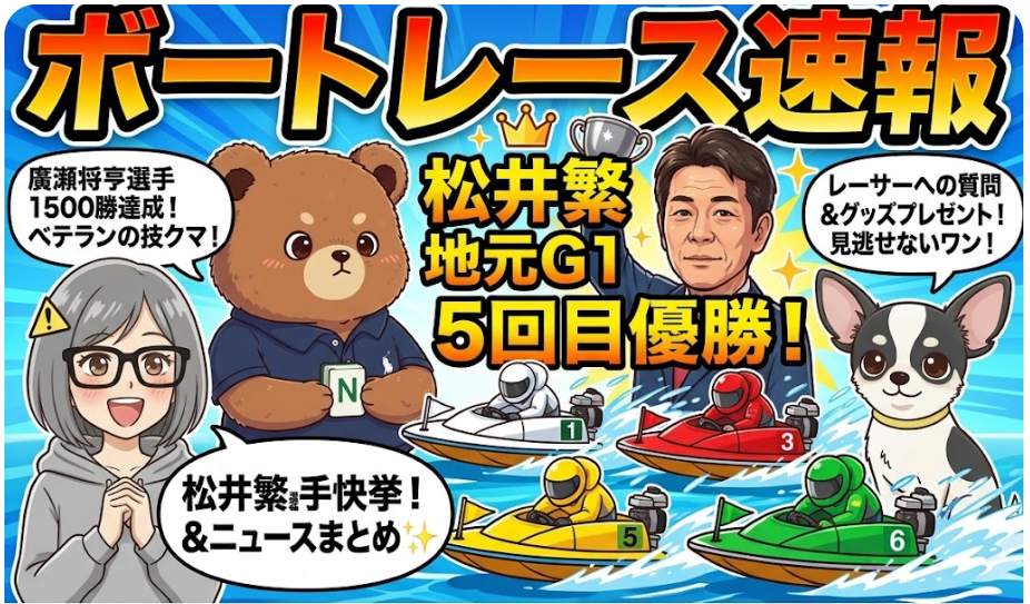 まずは、みんなも大注目していた「ボートレース住之江・GI太閤賞」だよね!なんと、我らが王者・松井繁選手が、地元住之江で5回目の周年記念を制覇したの!すごすぎる〜!✨