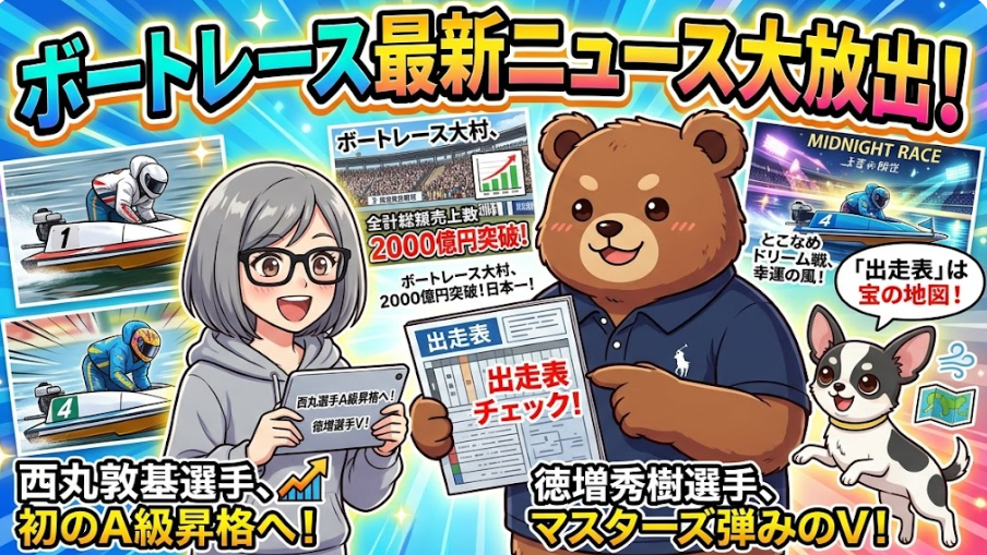 いかがでしたでしょうか?今日もボートレース界は、選手たちの熱い戦いや記録的なニュースで盛りだくさんでしたね!西丸選手のA級昇格への挑戦、徳増選手のベテランの輝き、大村の快挙、とこなめのドリーム戦、そして予想の鍵となる出走表!どれもこれも、ボートレースの奥深さと楽しさを感じさせてくれる話題ばかりでした。