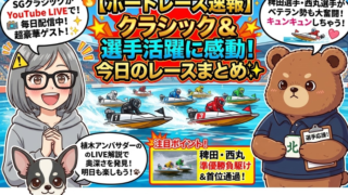 SG第61回ボートレースクラシックが蒲郡で開催中!機力劣勢の地元エース池田浩二選手が、最善を尽くす熱い走りに注目が集まる。3日目終了時点の勝負駆け状況も見逃せない!若松に誕生した全国最大級の新施設も紹介!
